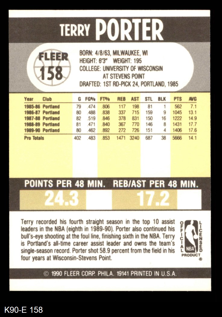1990 Fleer #158 Terry Porter 8 - NM/MT