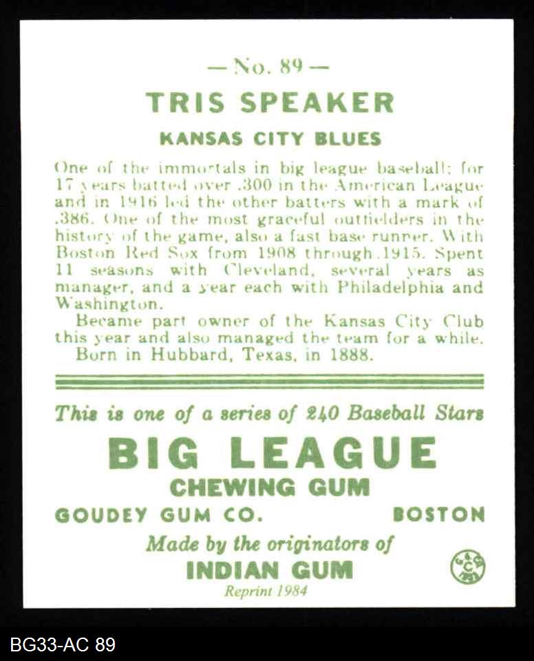 1933 Goudey Reprint #89 Tris Speaker 8 - NM/MT