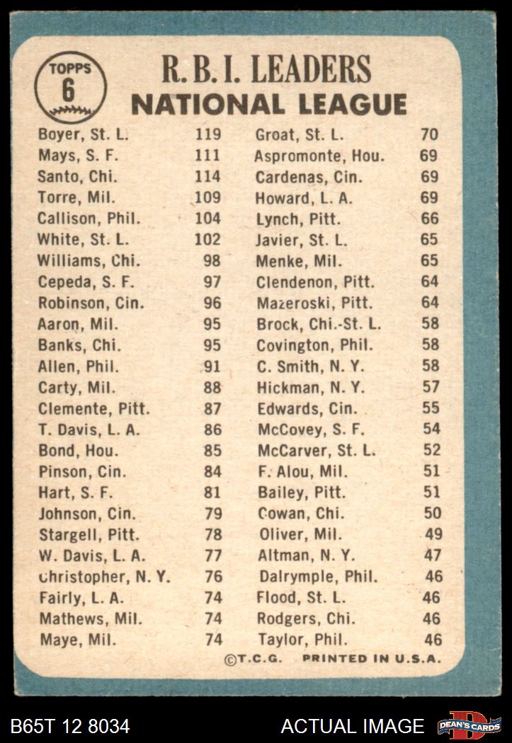 1965 Topps #6  -  Ken Boyer / Willie Mays / Ron Santo NL RBI Leaders Front Thumbnail