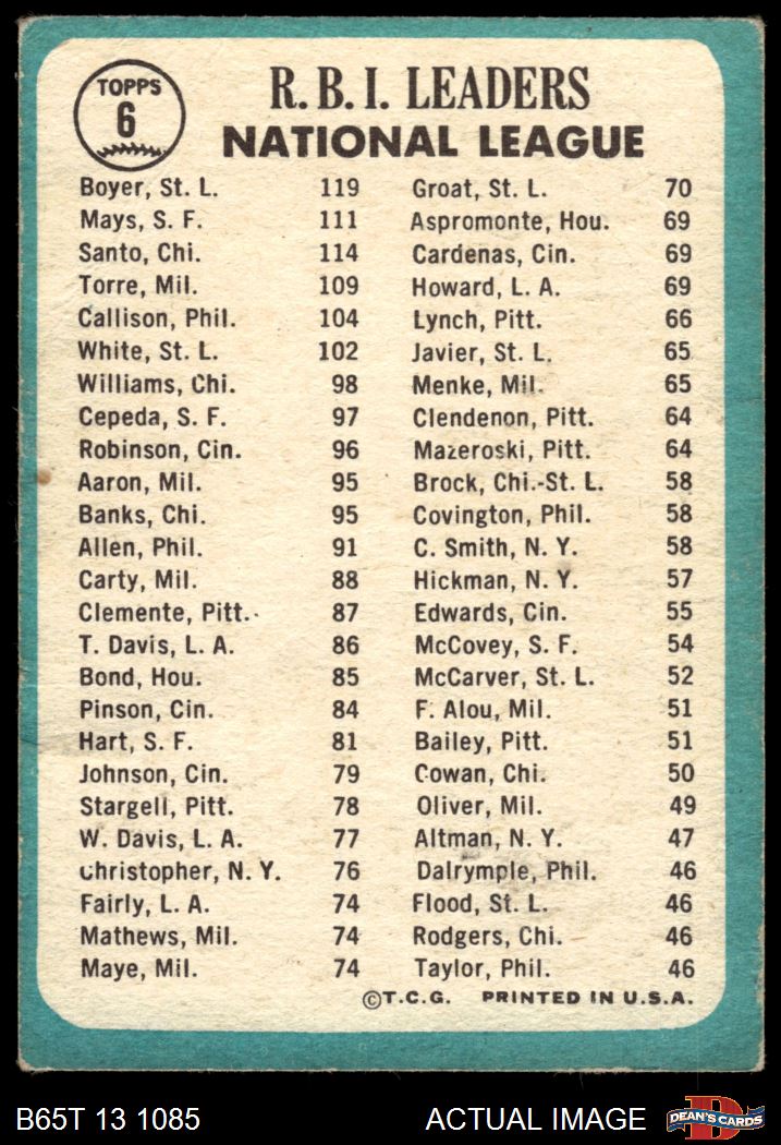 1965 Topps #6 - Ken Boyer / Willie Mays / Ron Santo NL RBI Leaders 1.5 - FAIR