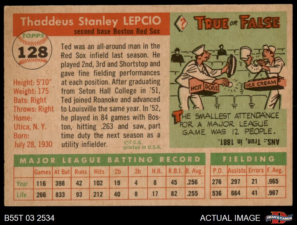 1955 Topps #128 Ted Lepcio 4 - VG/EX