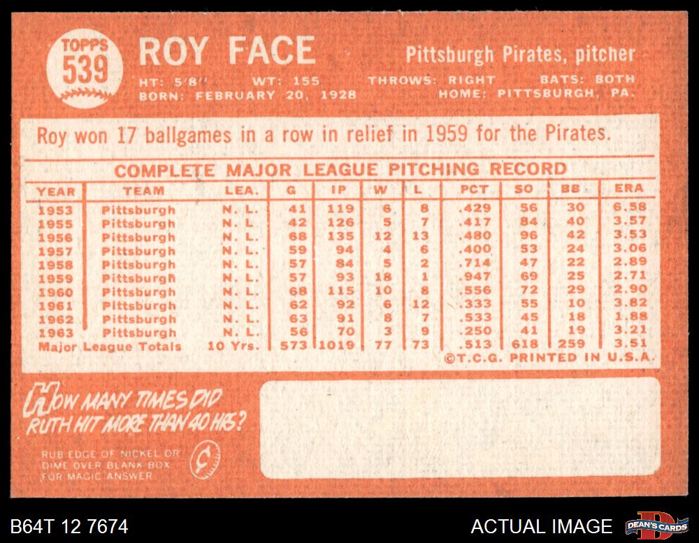1964 Topps #539 Roy Face 6 - EX/MT