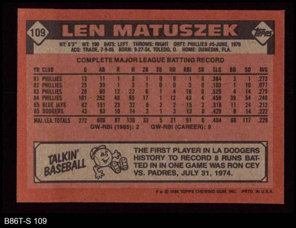 1986 Topps #109 Len Matuszek 8 - NM/MT
