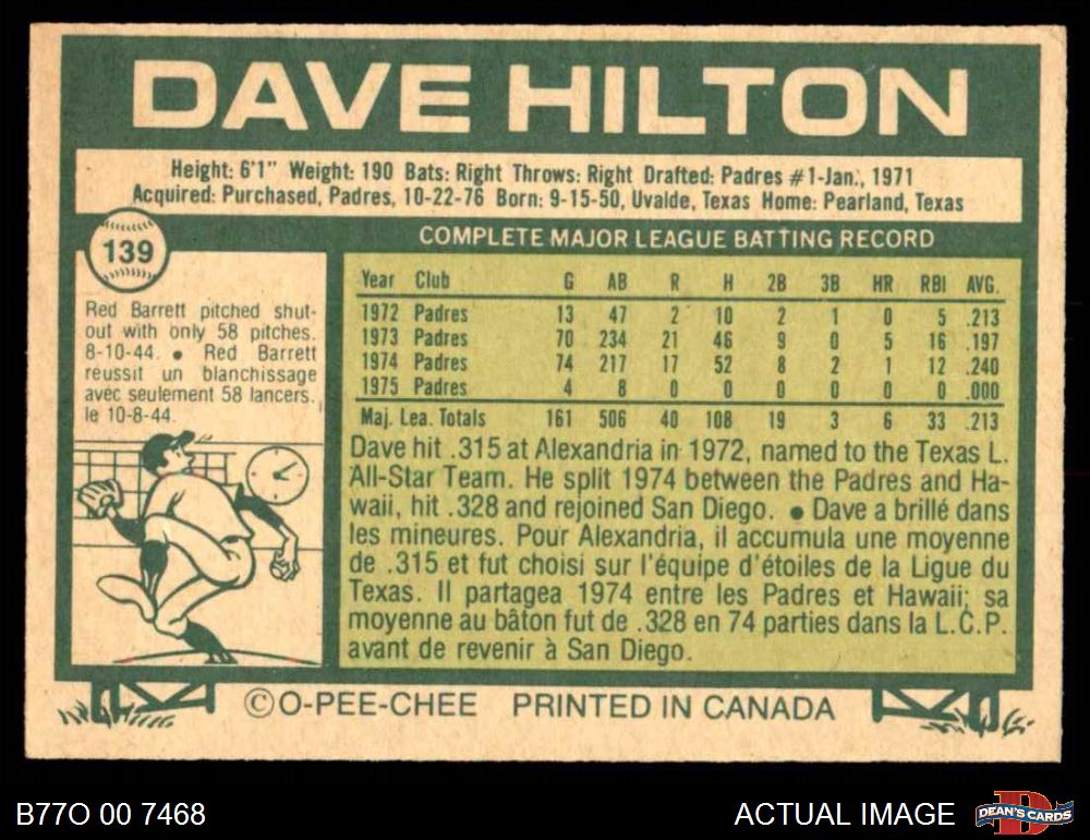 1977 O-Pee-Chee #139 Dave Hilton 4 - VG/EX