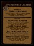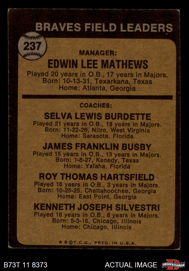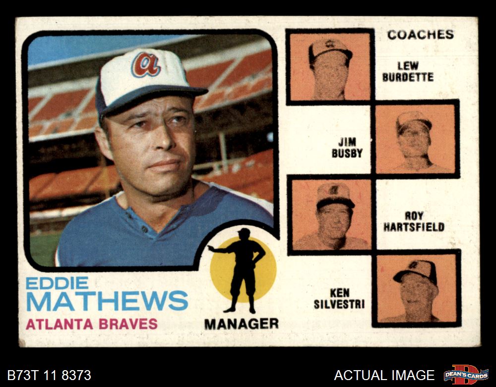 1973 Topps #237 xEAR - Eddie Mathews / Lew Burdette / Jim Busby / Roy Hartsfield / Ken Silvestri Braves Leaders 2 - GOOD