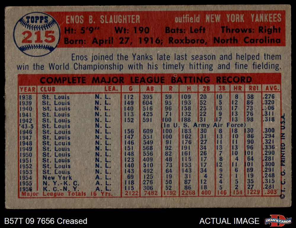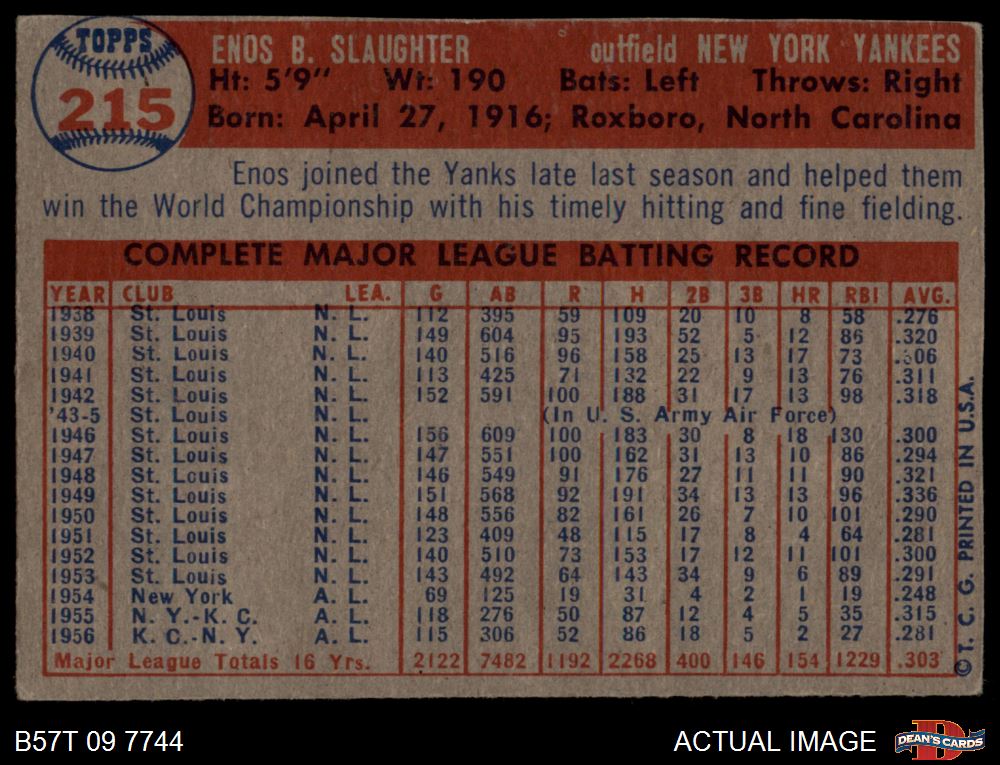 1957 Topps #215 Enos Slaughter 2 - GOOD