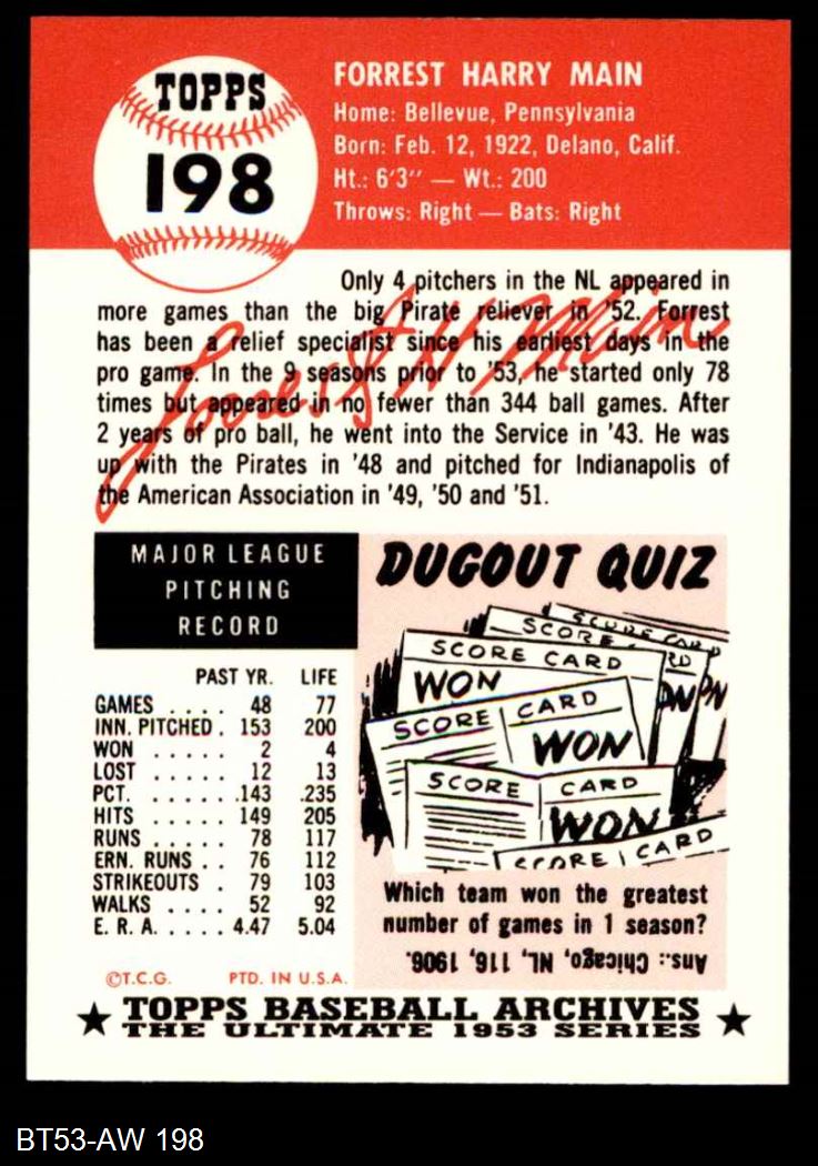 1953 Topps Archives #198 Forrest Main 8 - NM/MT