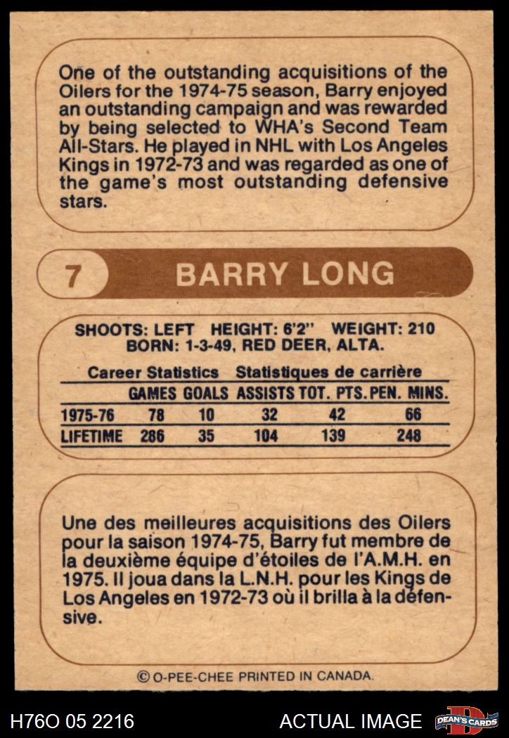 1976 O-Pee-Chee WHA #7 Barry Long 8 - NM/MT