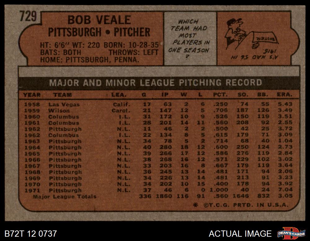 1972 Topps #729 Bob Veale 5 - EX