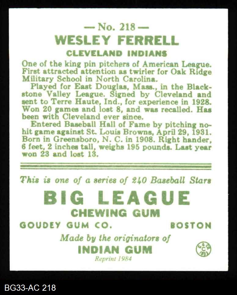 1933 Goudey Reprint #218 Wes Ferrell