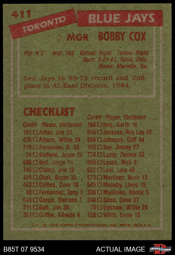 1985 Topps Baseball Cards (10,989 available)1985 Topps Blue Jays (487 available)