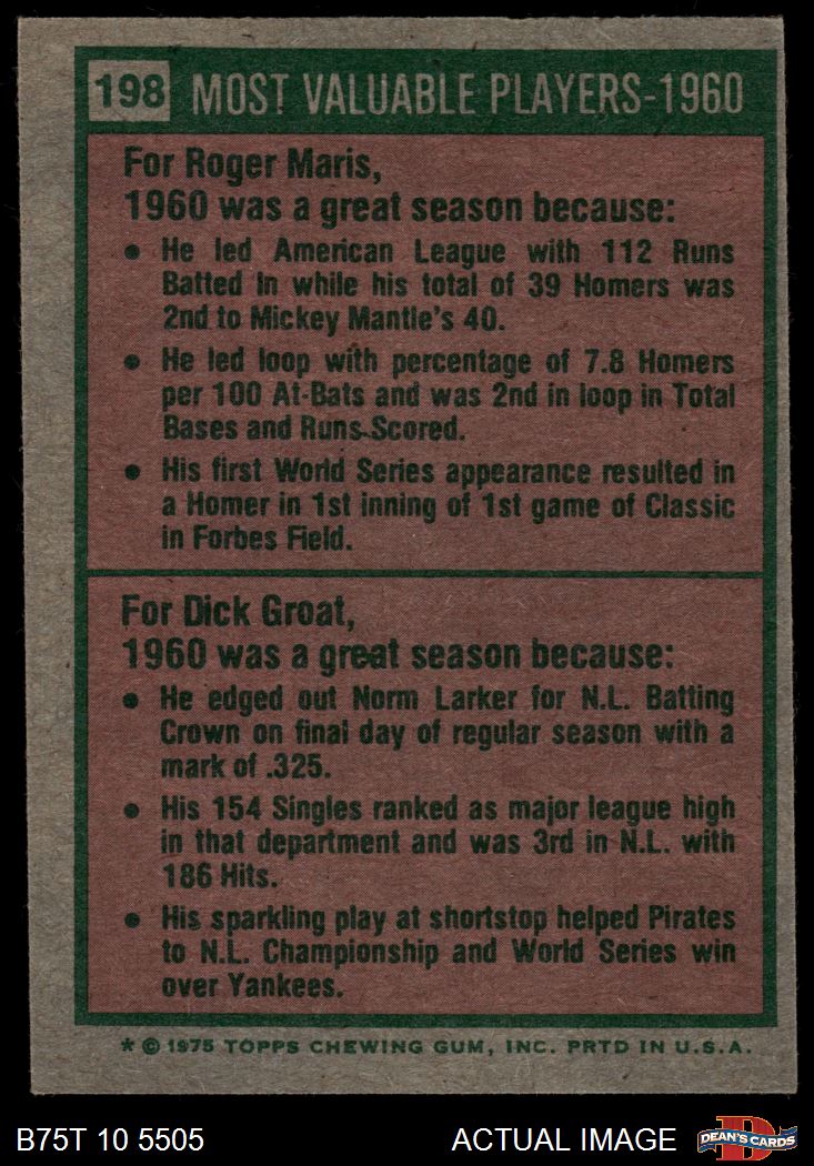 1975 Topps #198 - Roger Maris / Dick Groat 1960 MVPs 4 - VG/EX