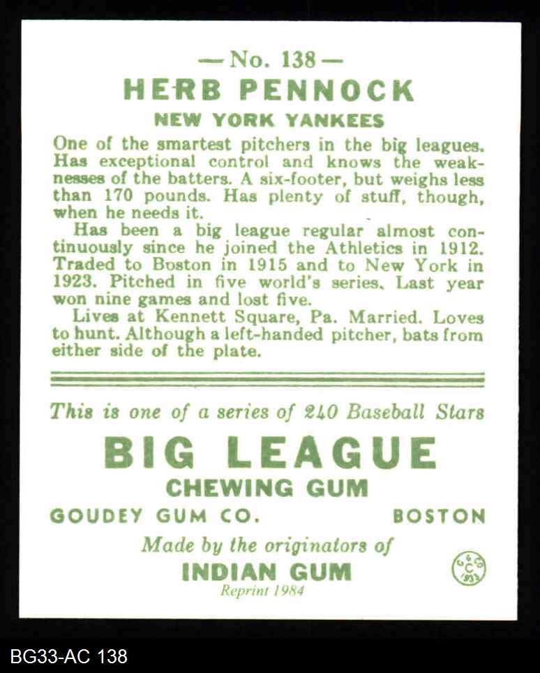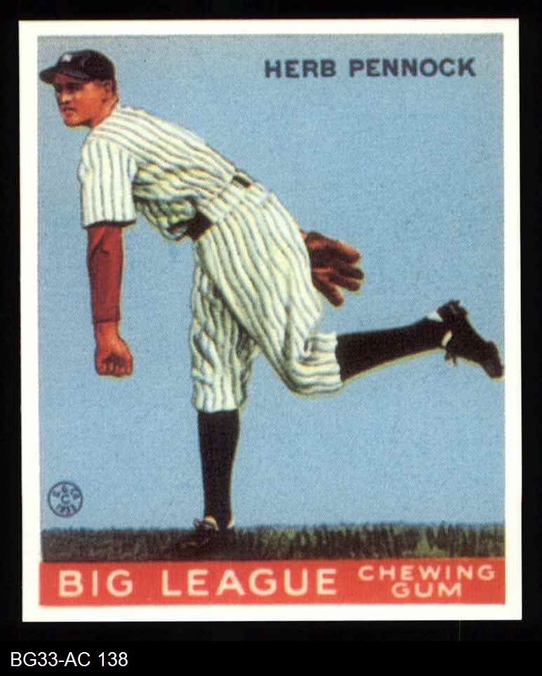 1933 Goudey Reprint #138 Herb Pennock 8 - NM/MT