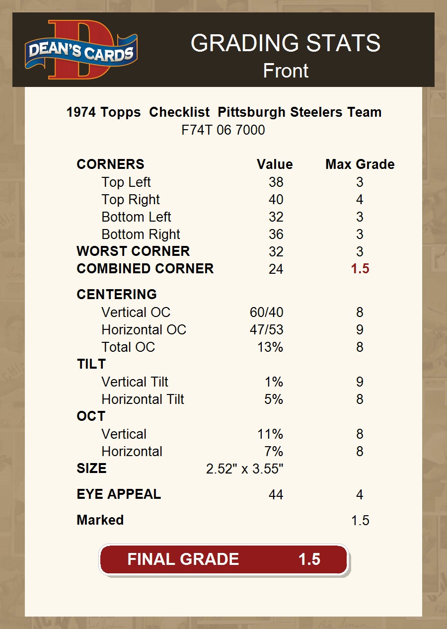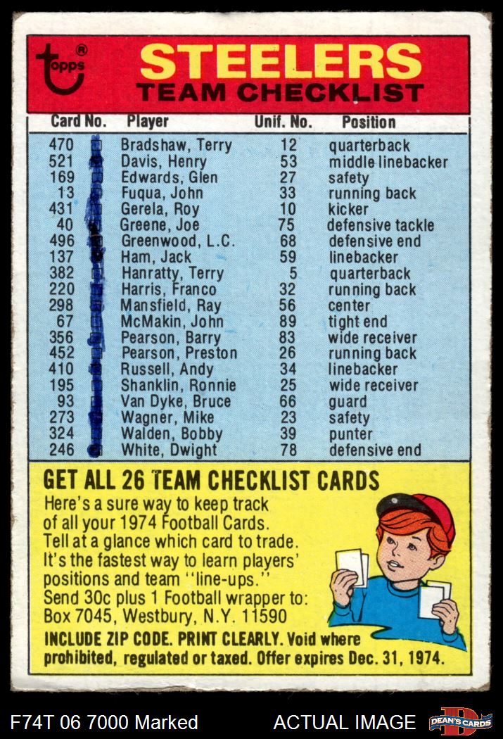1974 Topps Checklist Pittsburgh Steelers Team 1.5 - FAIR