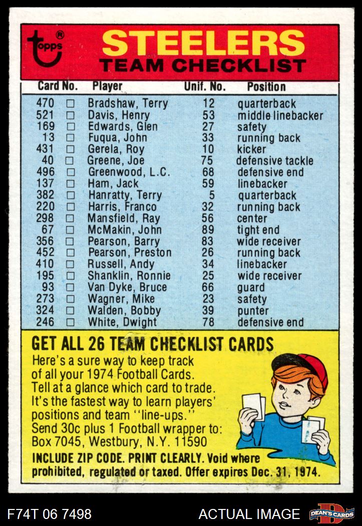 1974 Topps Football Cards (12,235 available)1974 Topps Checklist Steelers (11 available)
