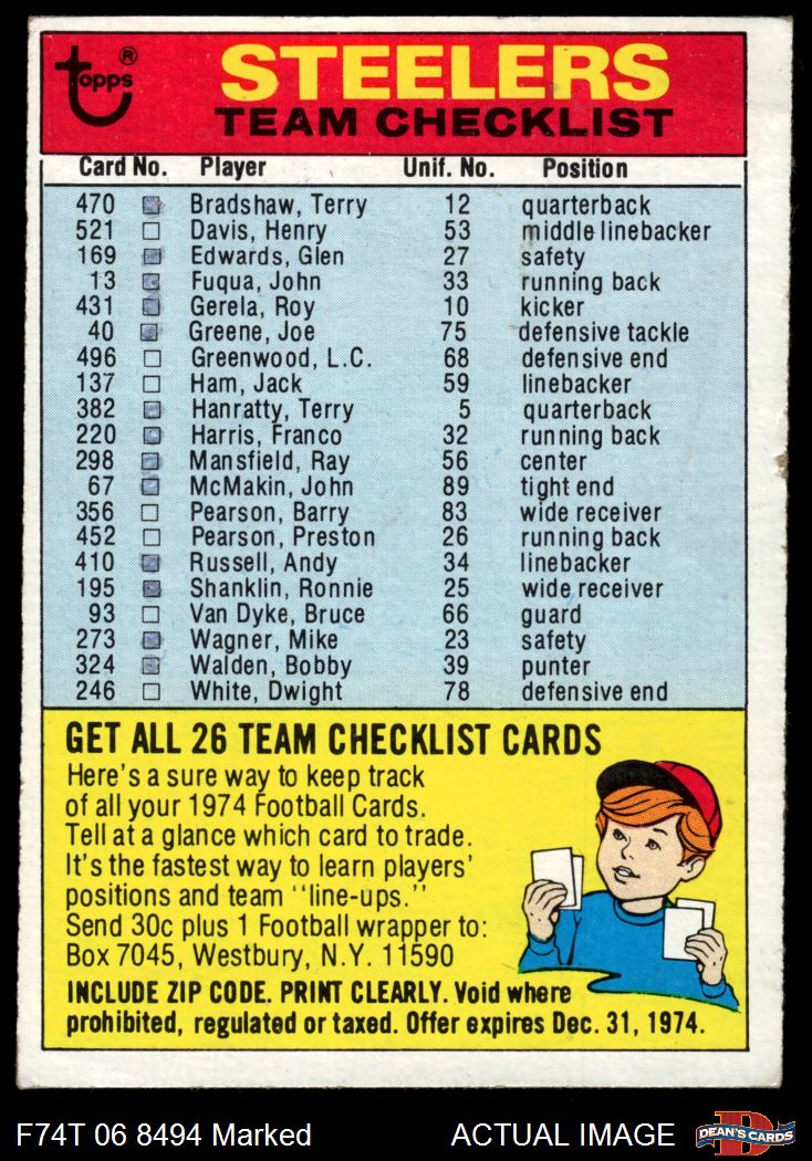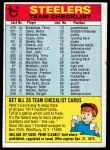 1974 Topps Checklist Pittsburgh Steelers Team