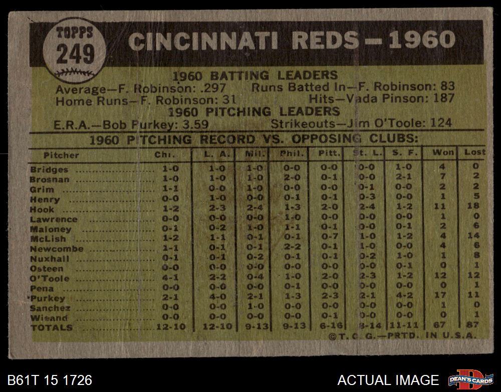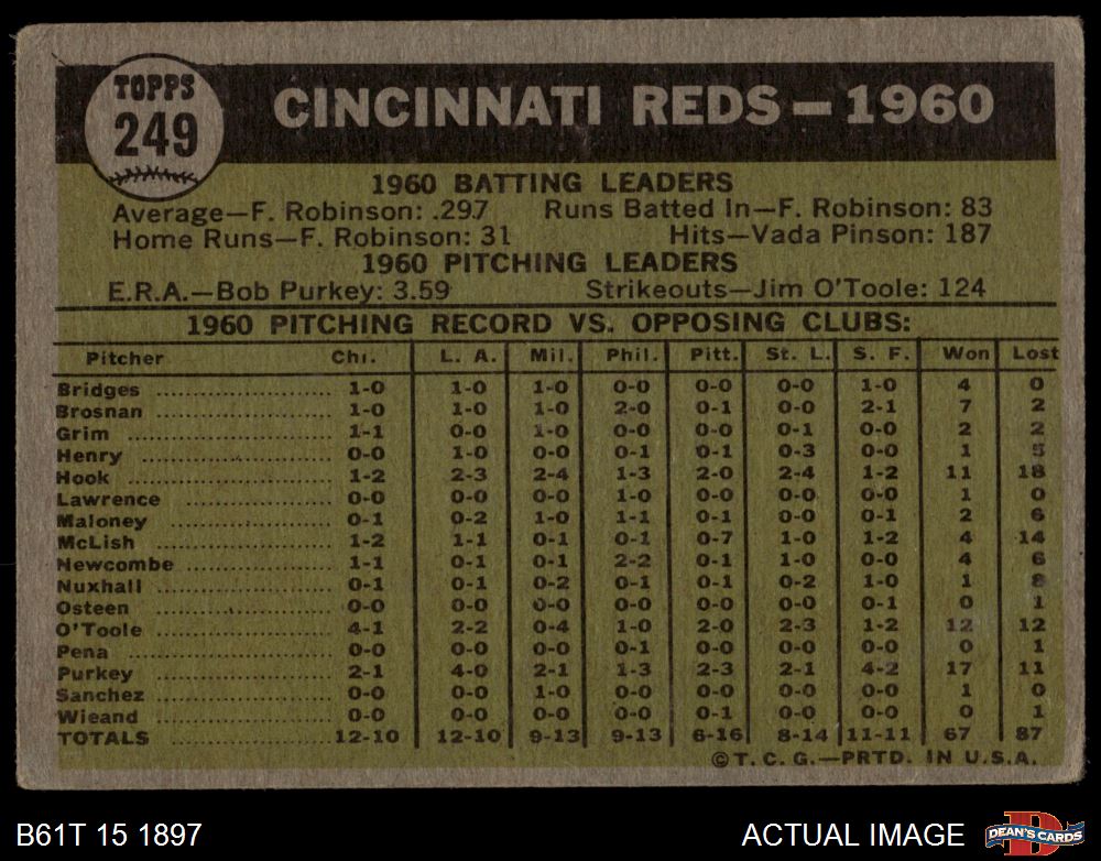 1961 Topps #249 May or May Not Have Notch Reds Team 1.5 - FAIR