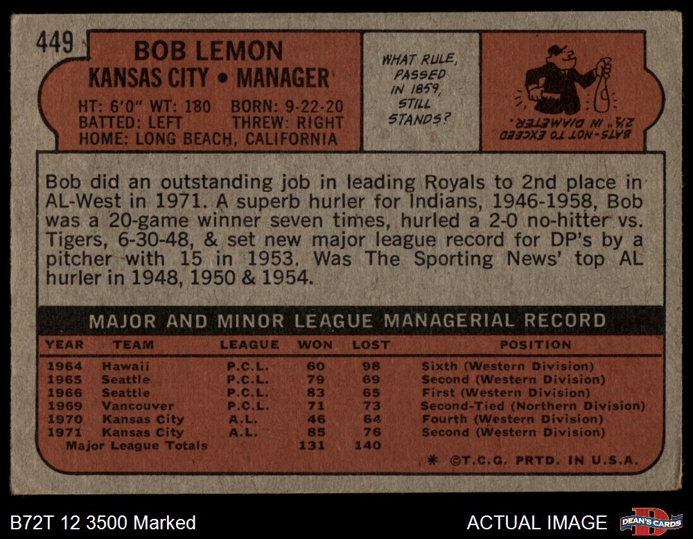 1972 Topps #449 Bob Lemon Front Thumbnail