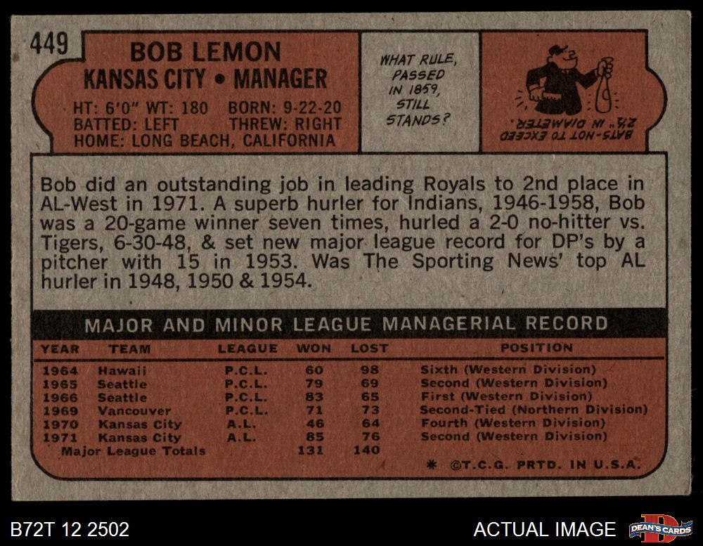 1972 Topps #449 Bob Lemon 4.5 - VG/EX+
