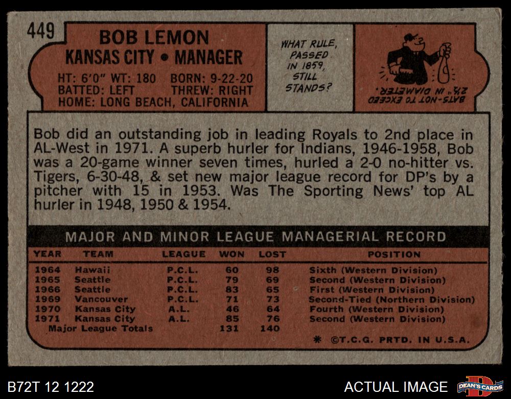 1972 Topps #449 Bob Lemon 5 - EX