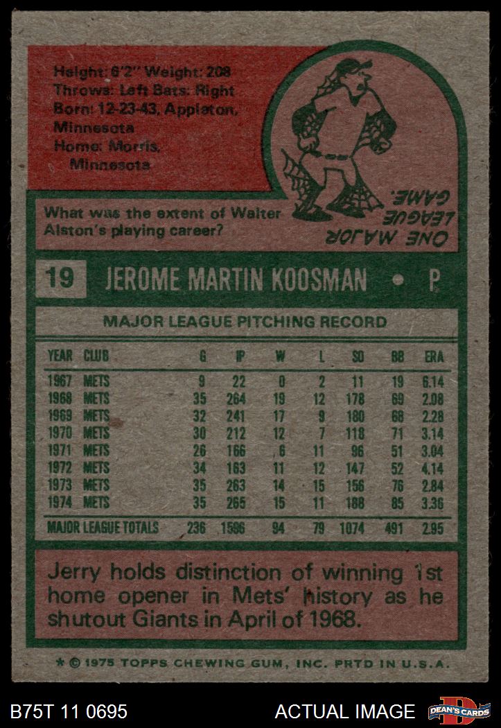 1975 Topps #19 Jerry Koosman 6 - EX/MT