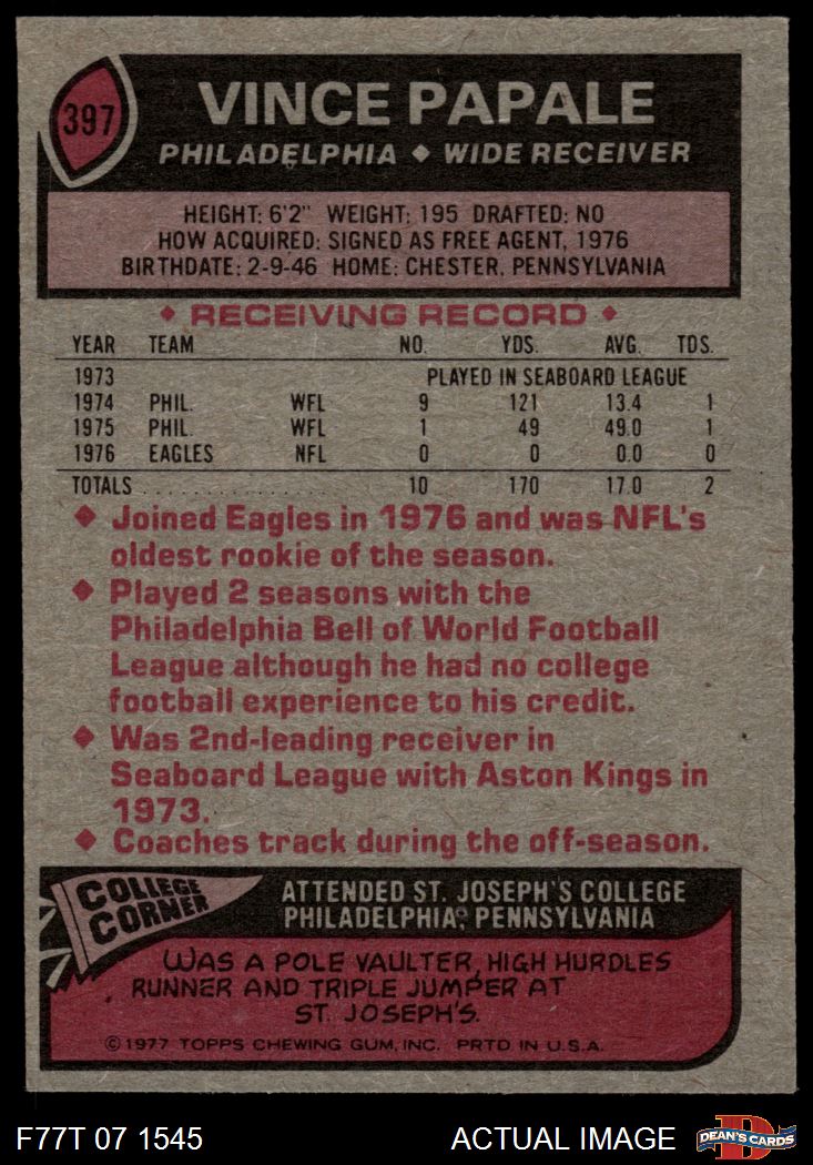 1977 Topps #397 Vince Papale 5 - EX