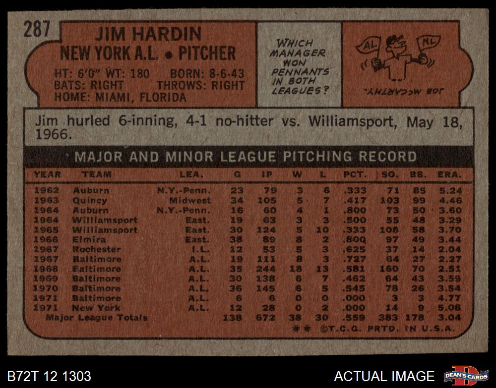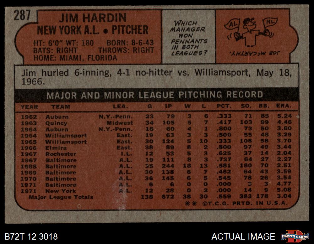 1972 Topps #287 Jim Hardin 3 - VG