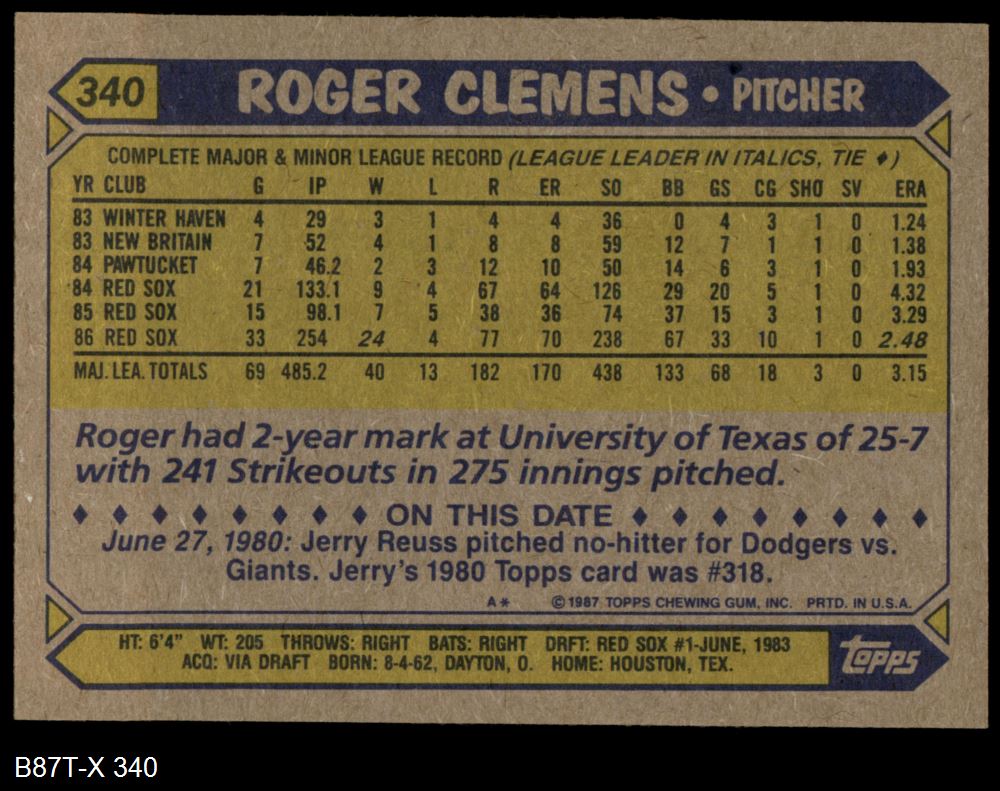 1987 Topps #340 Roger Clemens