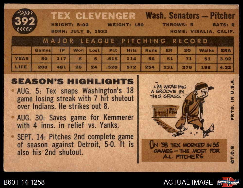 1960 Topps #392 Tex Clevenger 4 - VG/EX