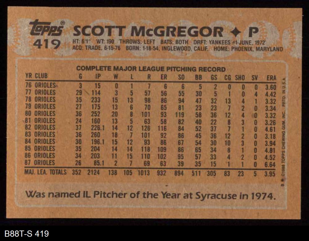 1988 Topps #419 Scott McGregor 8 - NM/MT