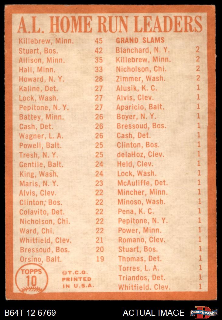 1964 Topps #10 - Harmon Killebrew / Bob Allison / Dick Stuart AL HR Leaders 3 - VG