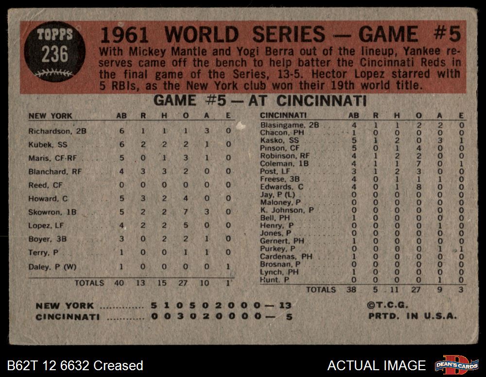 1962 Topps #236 1961 World Series - Game #5 - Yanks Crush Reds in Finale 2 - GOOD