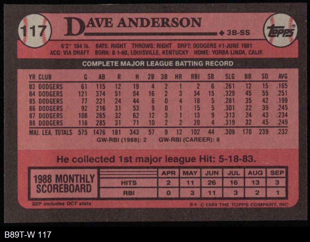 1989 Topps #117 Dave Anderson 8 - NM/MT