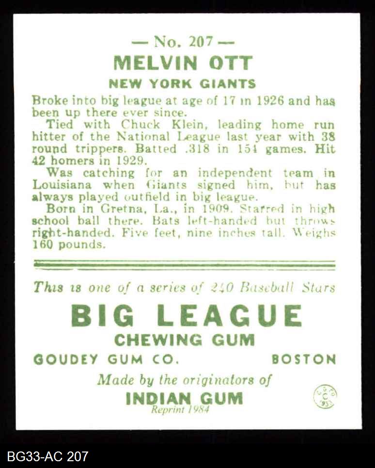 1933 Goudey Reprint #207 Mel Ott 8 - NM/MT