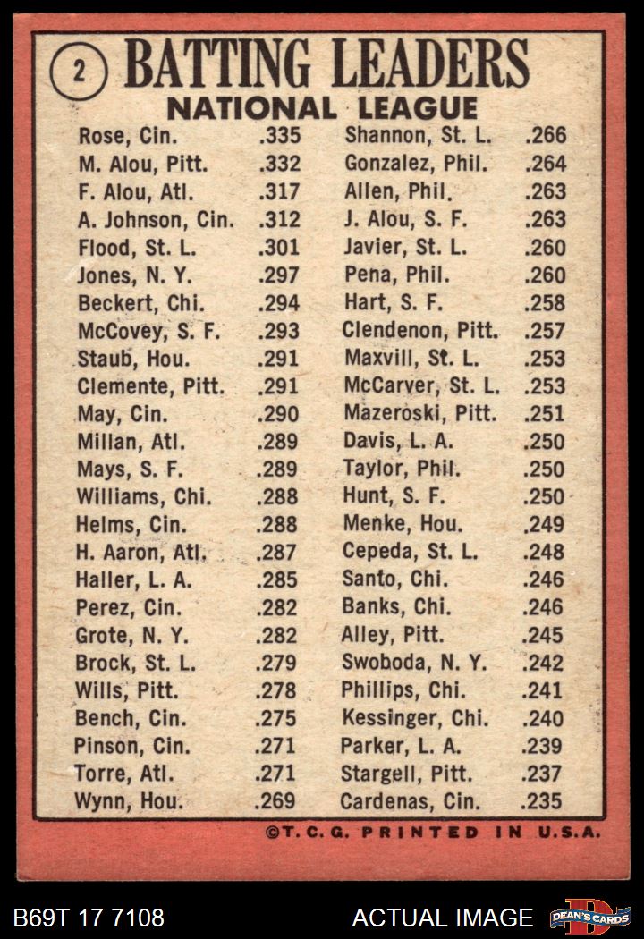 1969 Topps #2 - Pete Rose / Matty Alou / Felipe Alou NL Batting Leaders 4 - VG/EX