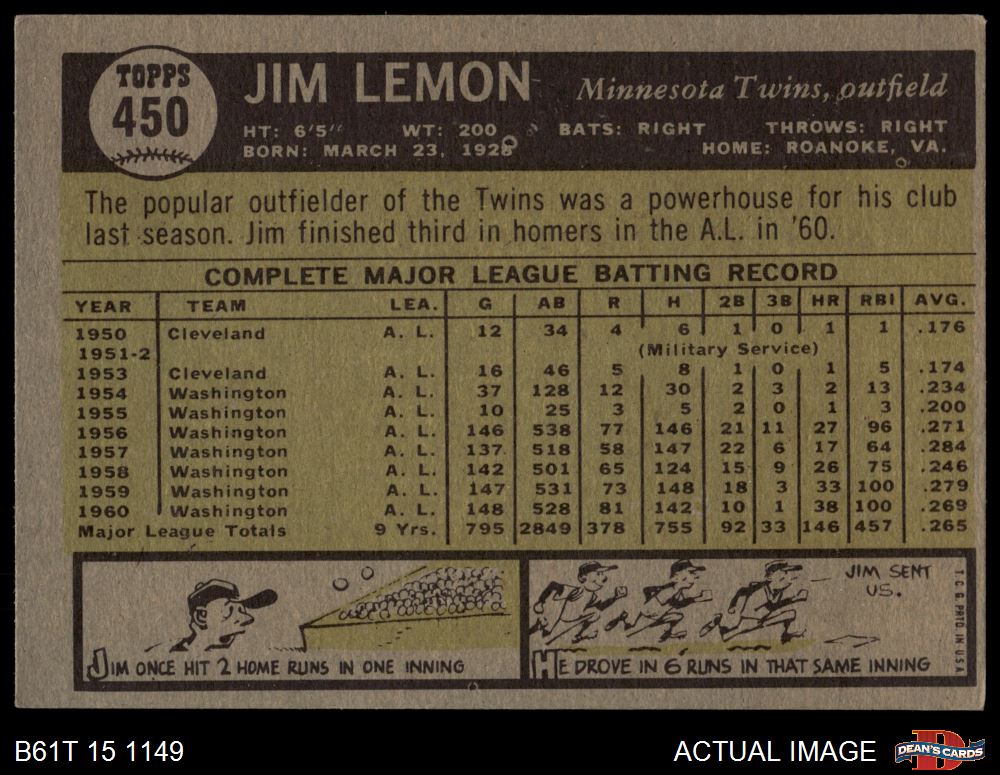 1961 Topps #450 Jim Lemon 2 - GOOD