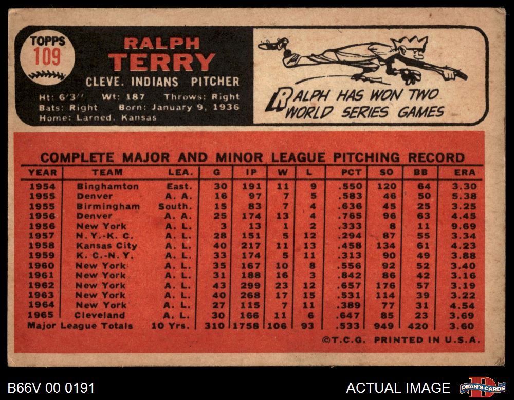 1966 Topps Venezuelan #109 Ralph Terry 4 - VG/EX