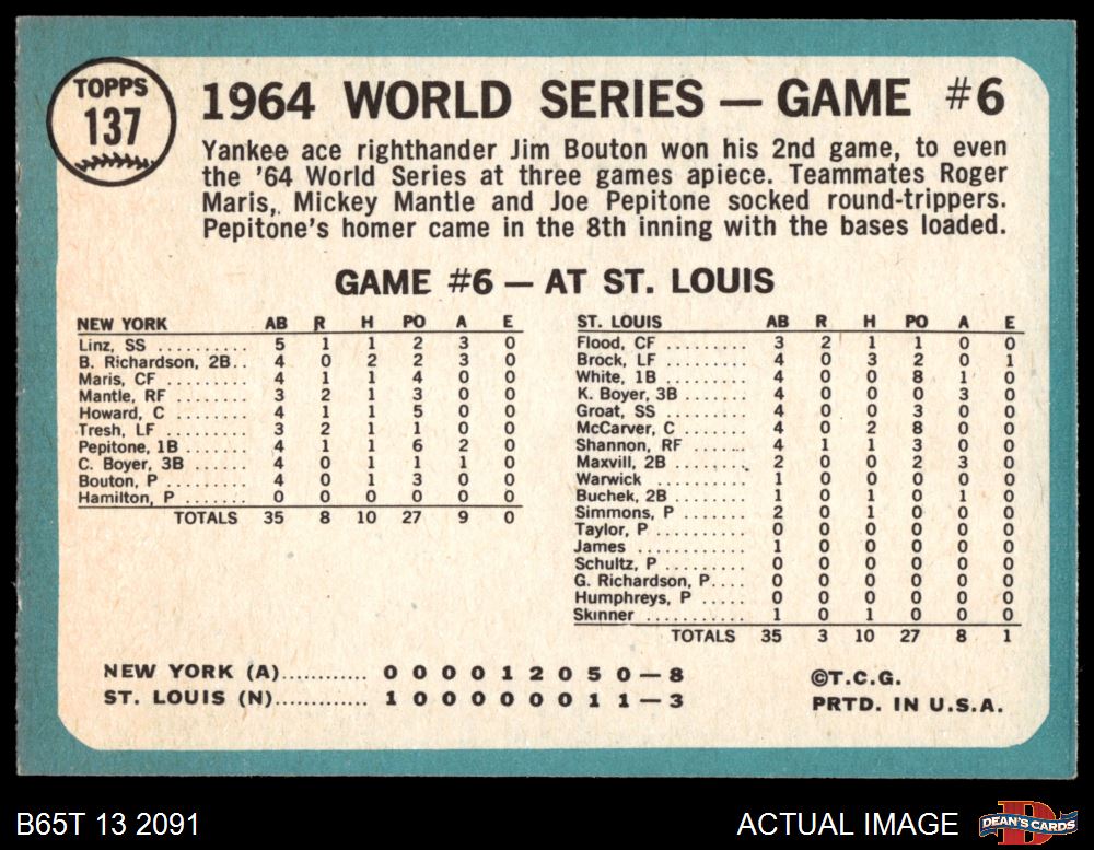 1965 Topps #137 - Jim Bouton 1964 World Series - Game #6 - Bouton Wins Again 6.5 - EX/MT+