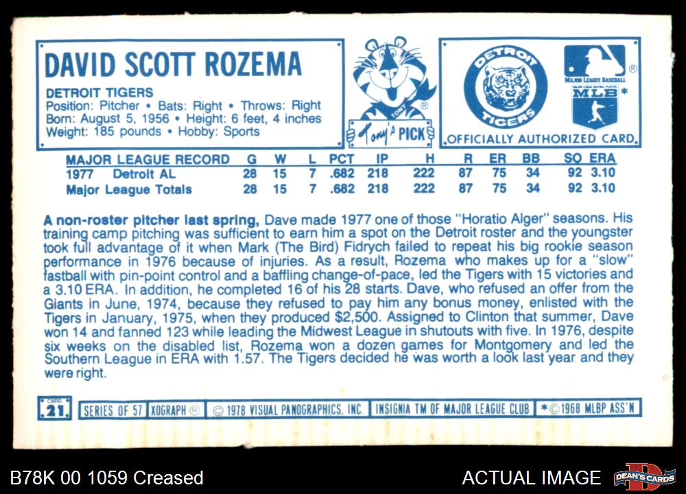 1978 Kellogg's #21 Dave Rozema Front Thumbnail