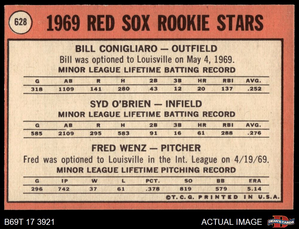 1969 Topps #628 - Billy Conigliaro / Syd O'Brien / Fred Wenz Red Sox Rookies 5 - EX