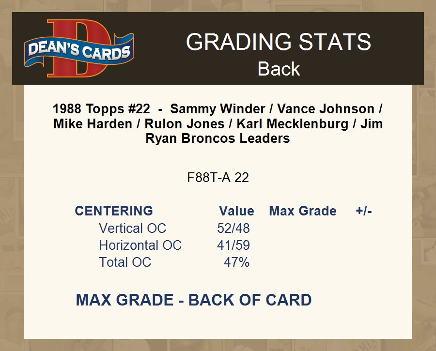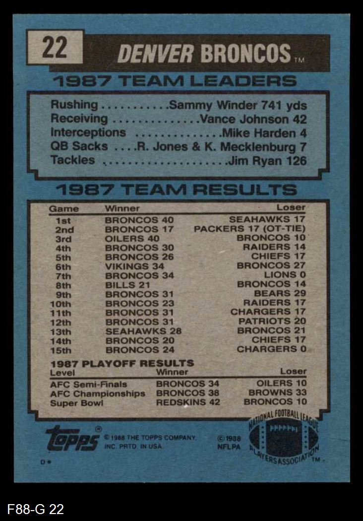 1988 Topps #22 - Sammy Winder / Vance Johnson / Mike Harden / Rulon Jones / Karl Mecklenburg / Jim Ryan Broncos Leaders 8 - NM/MT