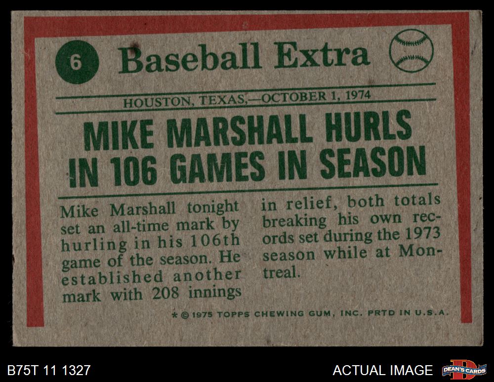 1975 Topps #6 - Mike Marshall Marshall Hurls In 106 Games 3 - VG