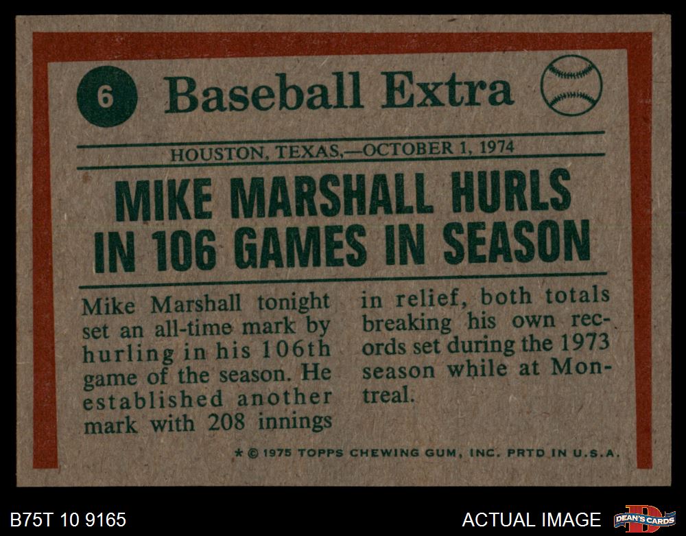 1975 Topps #6 - Mike Marshall Marshall Hurls In 106 Games 7 - NM