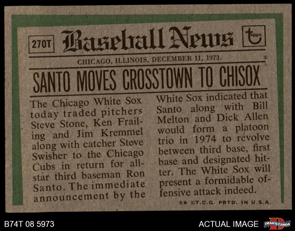 1974 Topps Traded #270 T - Ron Santo Traded 6 - EX/MT