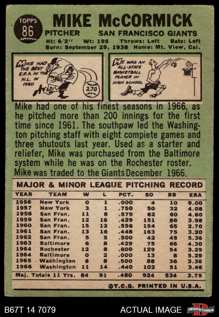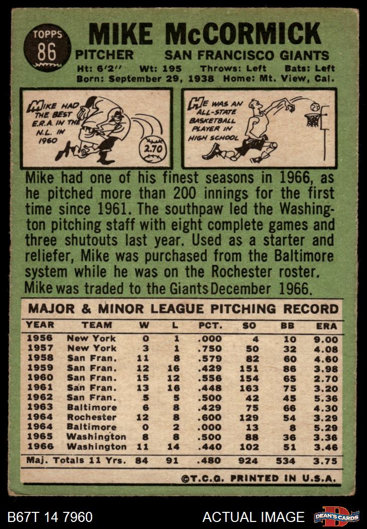 1967 Topps #86 TR Mike McCormick 2 - GOOD
