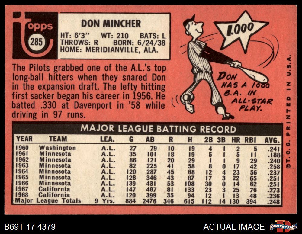 1969 Topps #285 Don Mincher 6.5 - EX/MT+