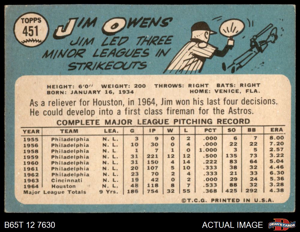 1965 Topps #451 Jim Owens 2.5 - GD+