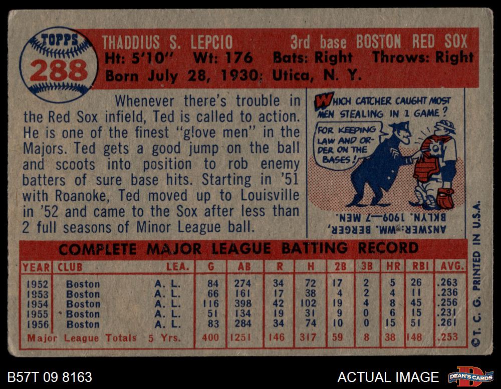 1957 Topps #288 Ted Lepcio 2 - GOOD