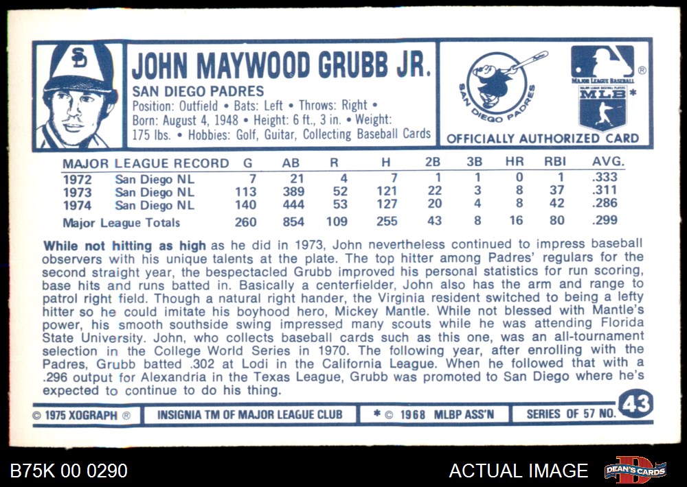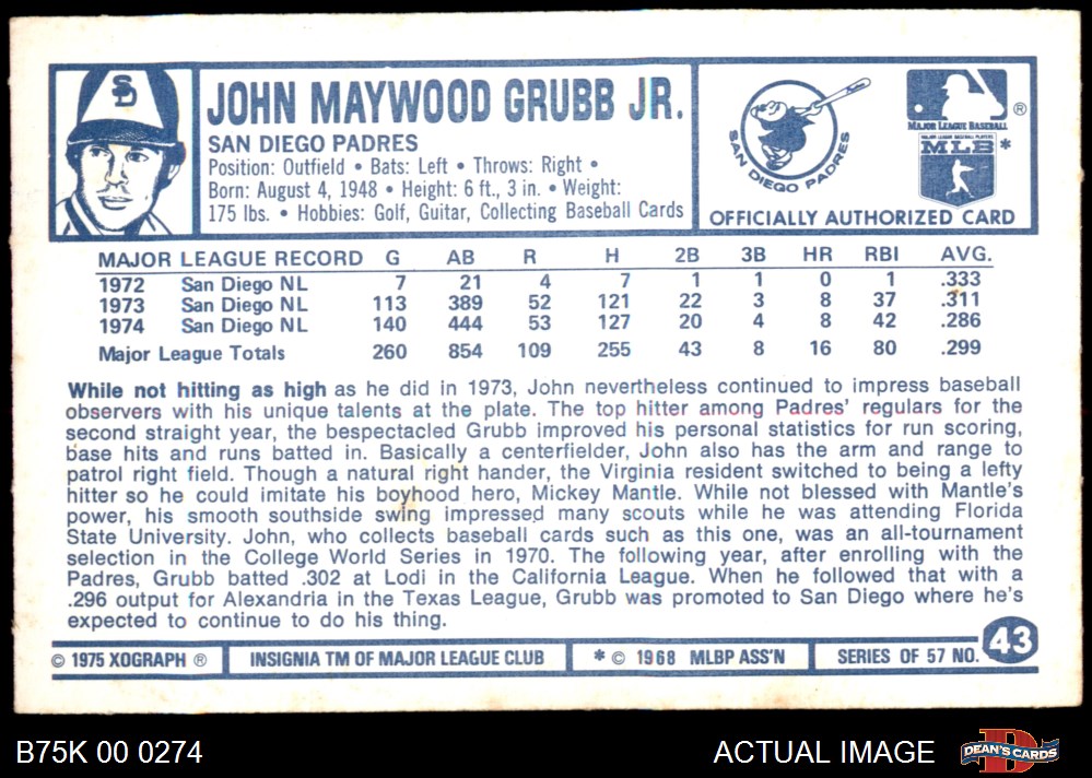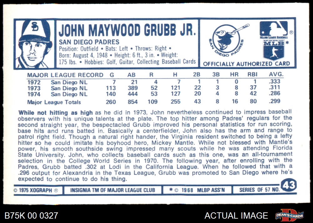1975 Kellogg's #43 Johnny Grubb 8 - NM/MT