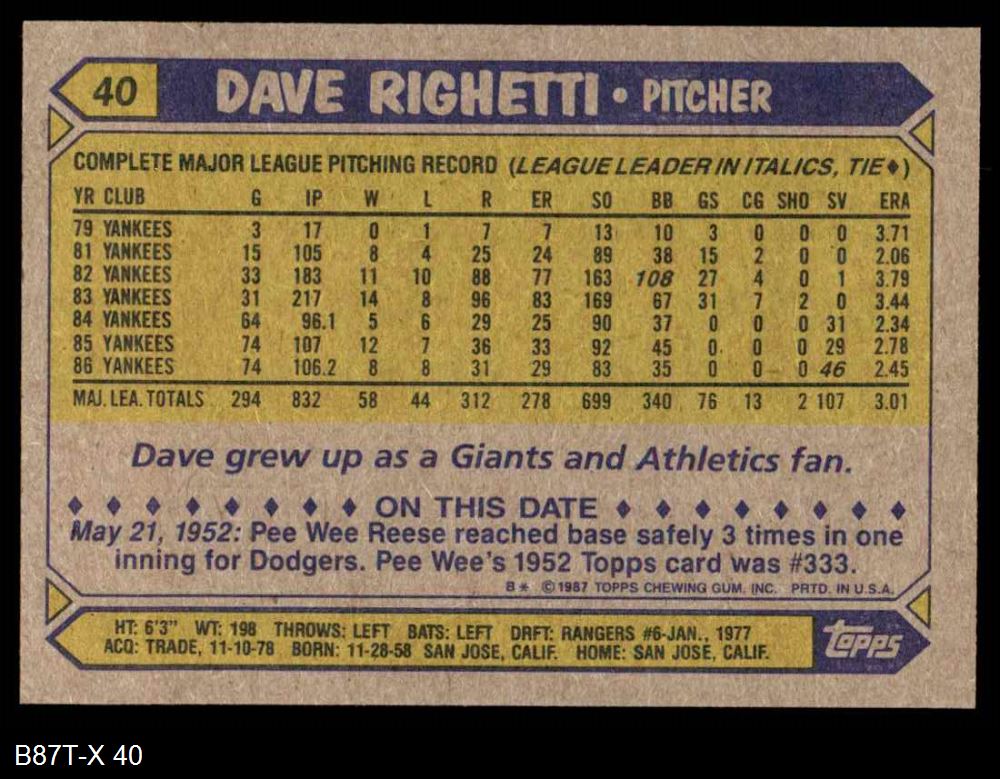 1987 Topps #40 Dave Righetti